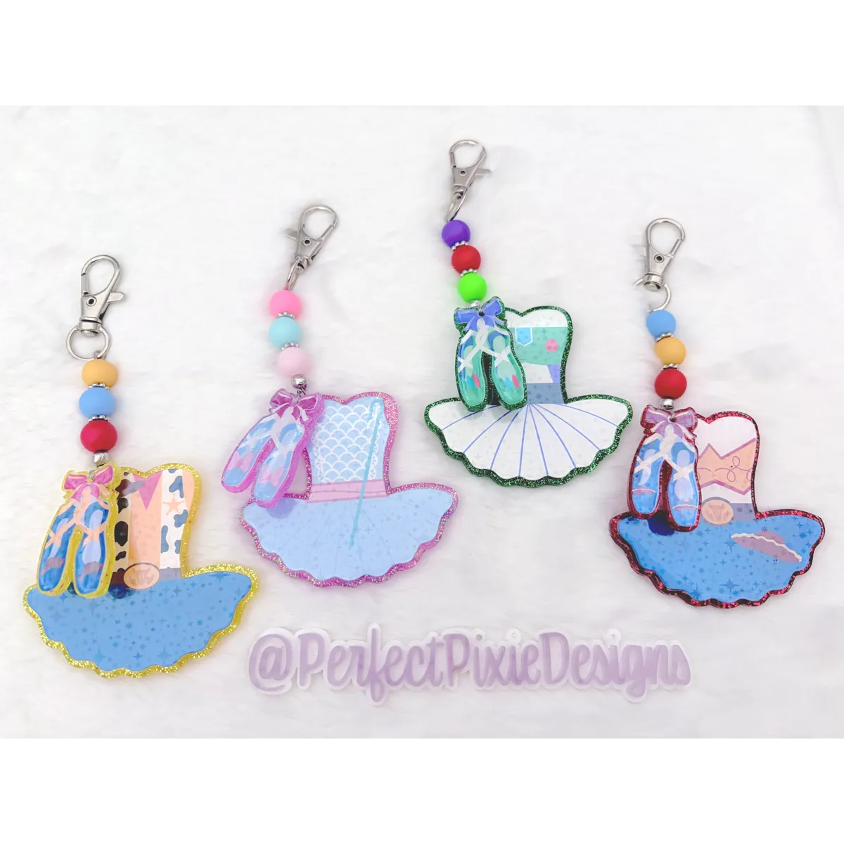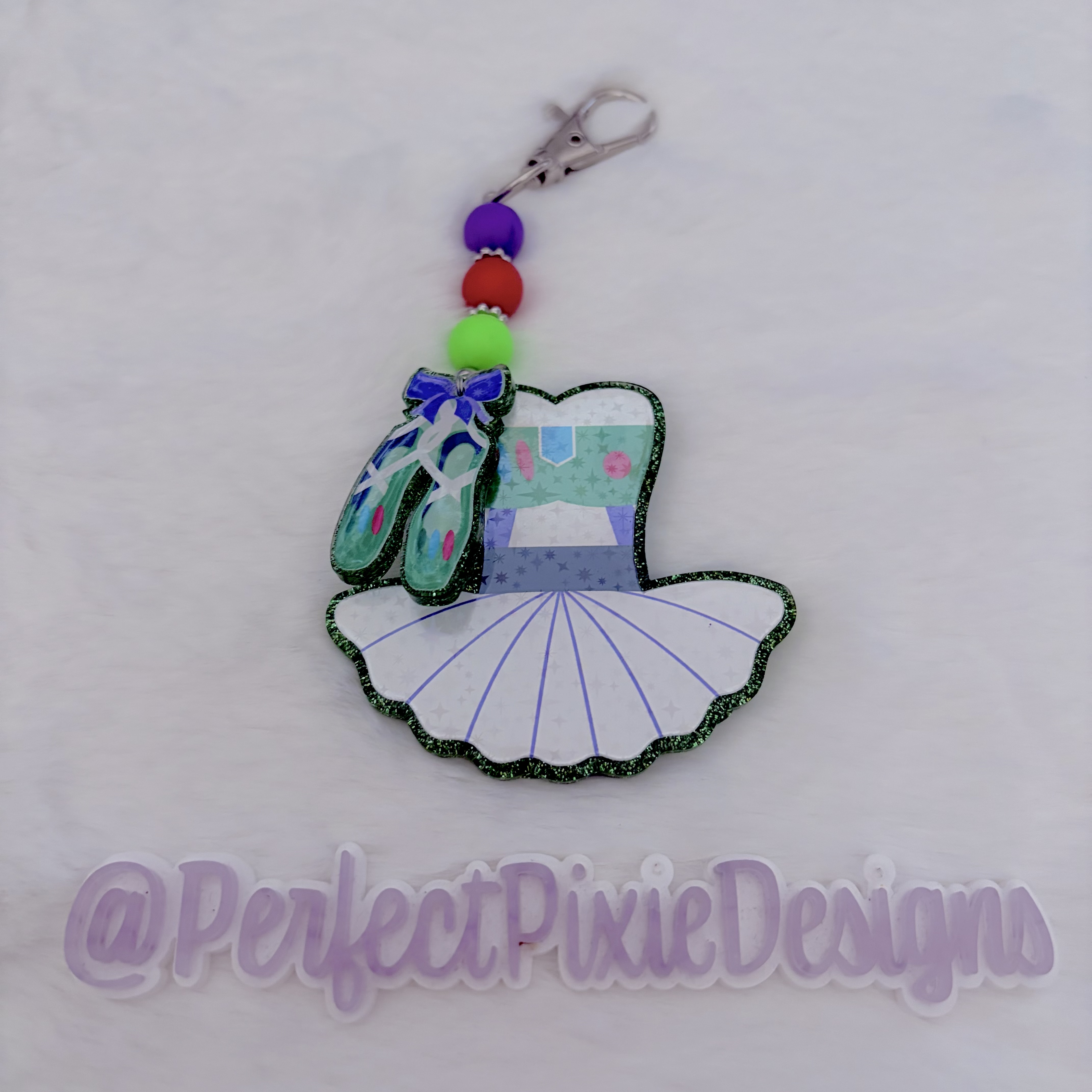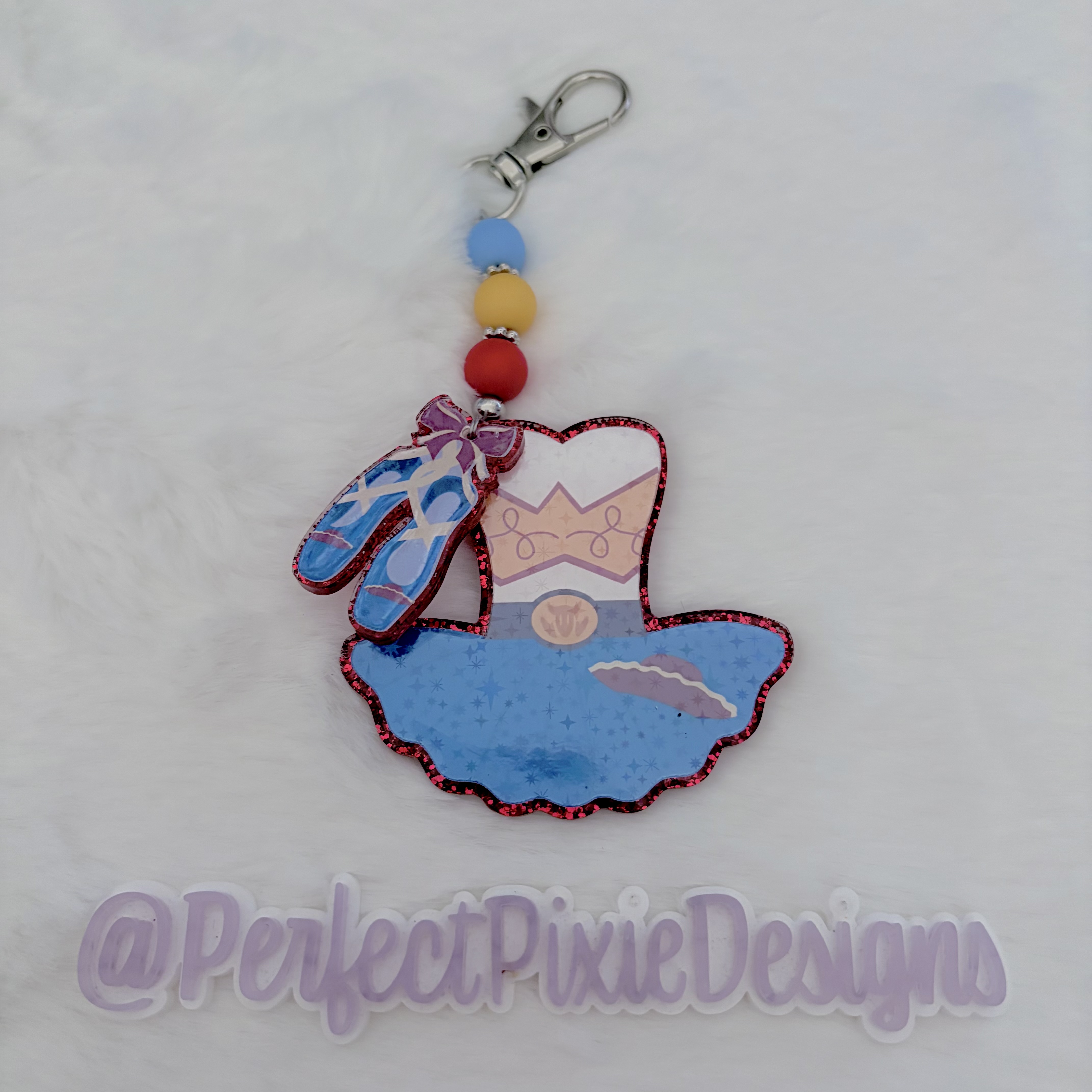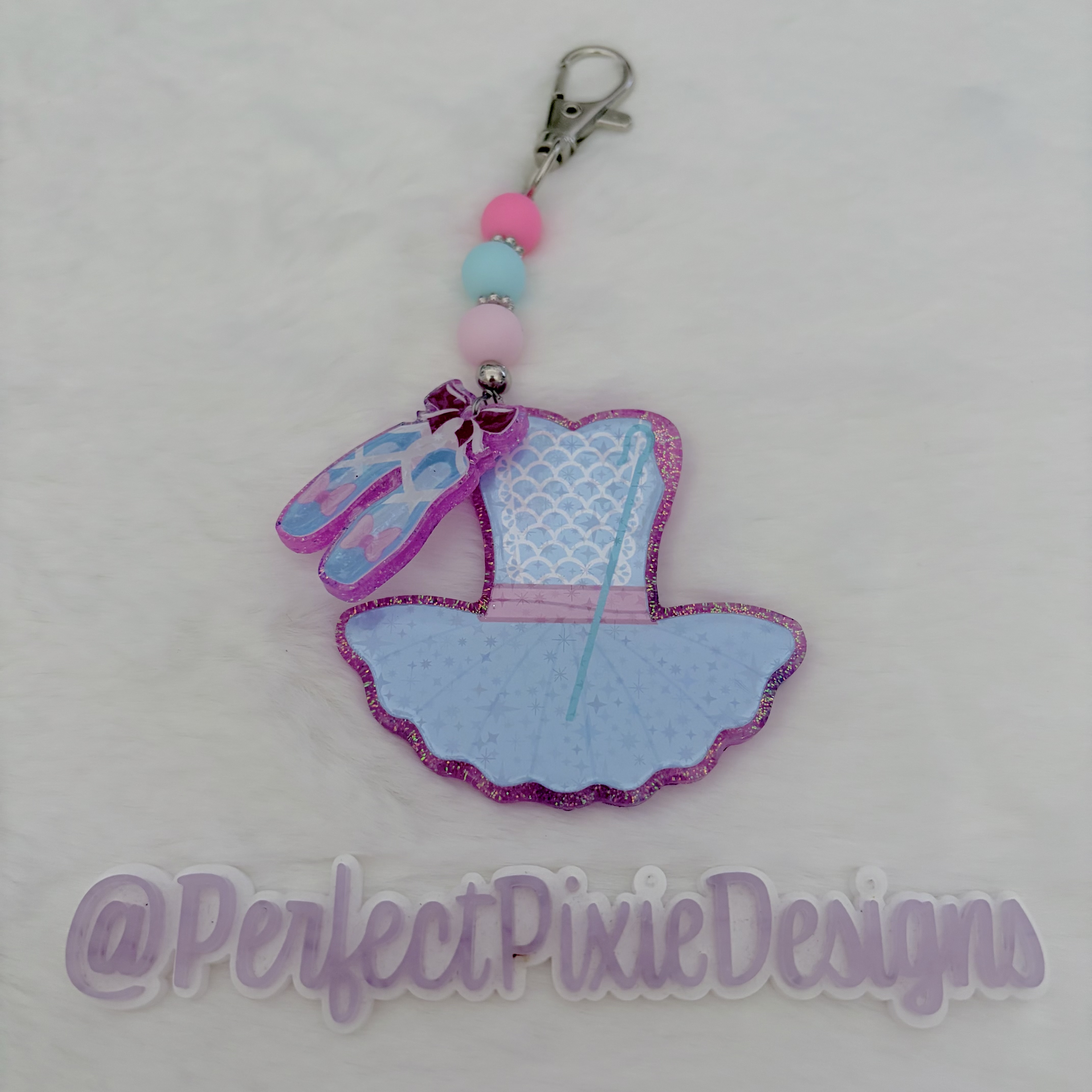 Our keychain/bag charms are made from acrylic, resin, sealed glitter and glass bead accents. Images are printed on waterproof vinyl and laminated, then sealed under resin. They are rated as "water resistant", but do not submerge them or expose them to extreme temperatures for long periods of time. Please take care to avoid bumping on hard surfaces.