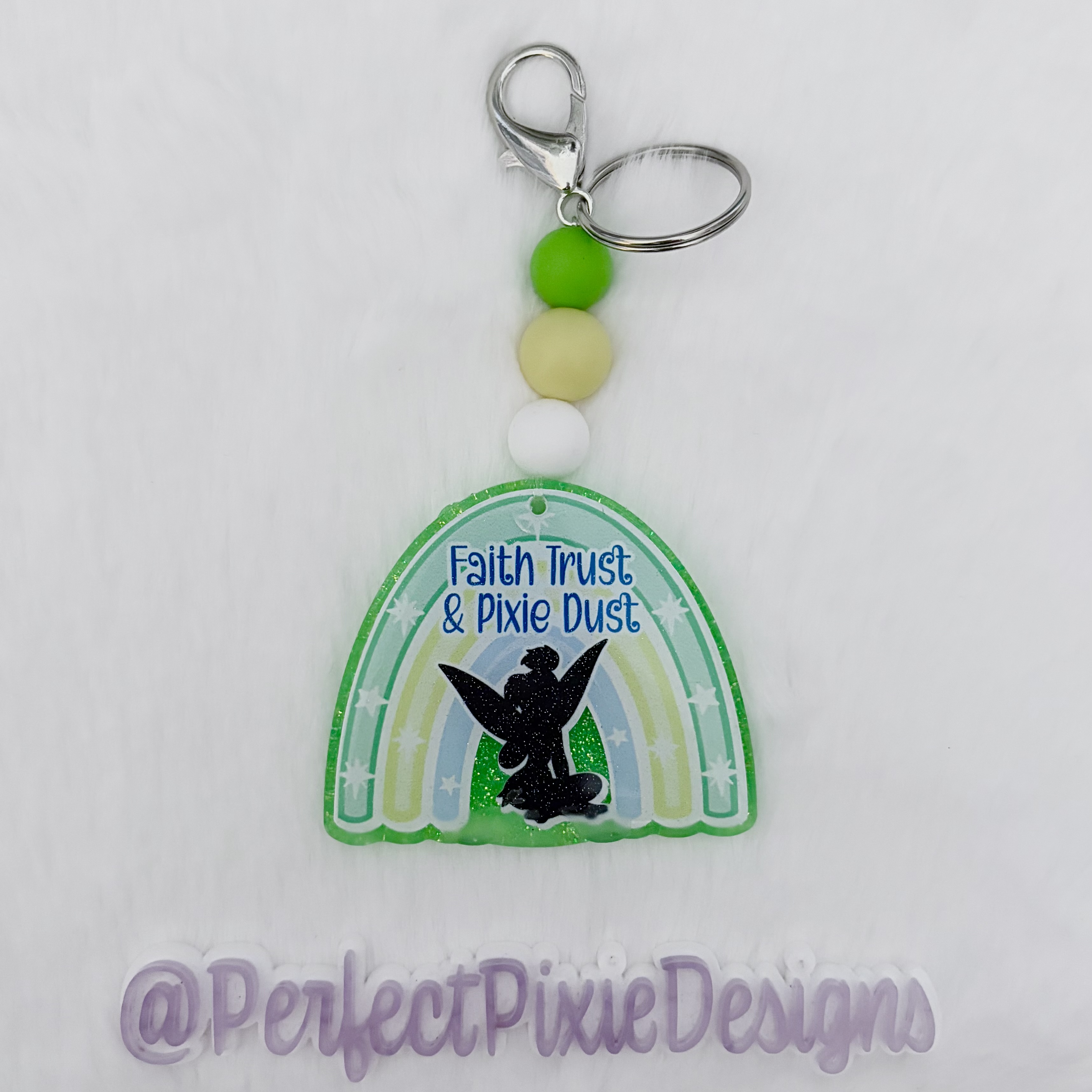 Our keychain/bag charms are made from acrylic, resin, sealed glitter and glass bead accents.  Images are printed on waterproof vinyl and laminated, then sealed under resin.  They are rated as "water resistant", but do not submerge them or expose them to extreme temperatures for long periods of time.  Please take care to avoid bumping on hard surfaces.