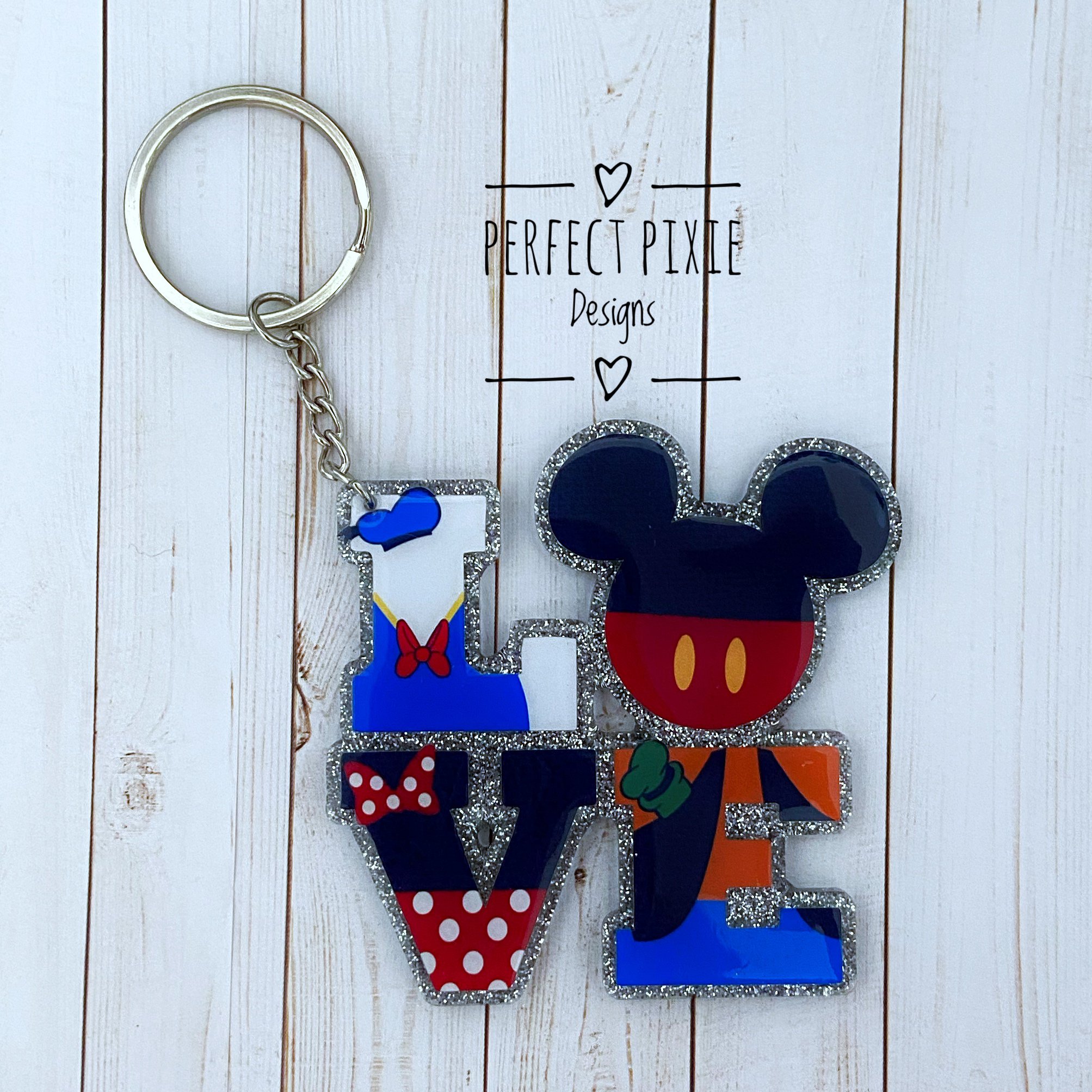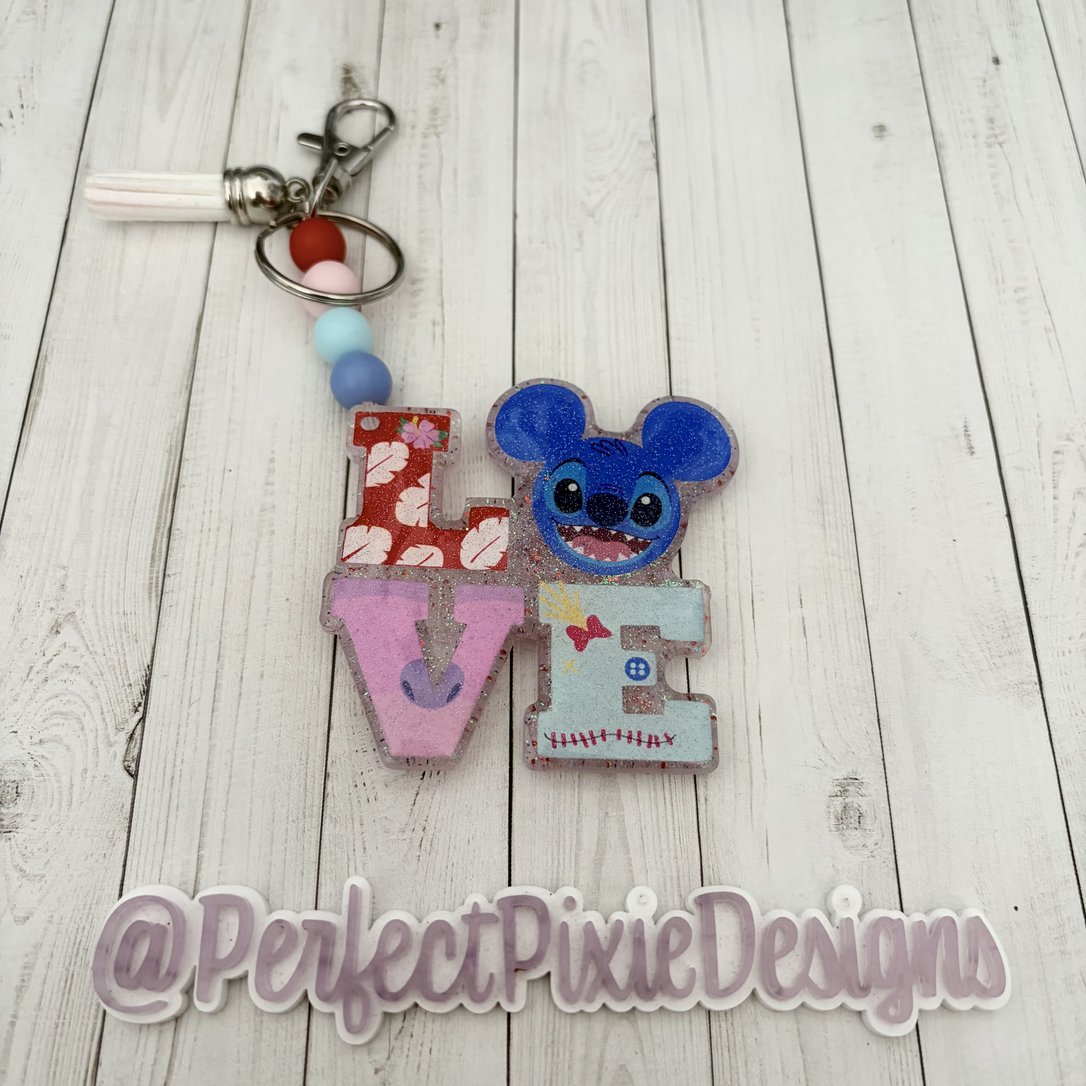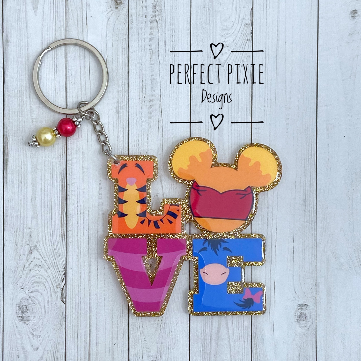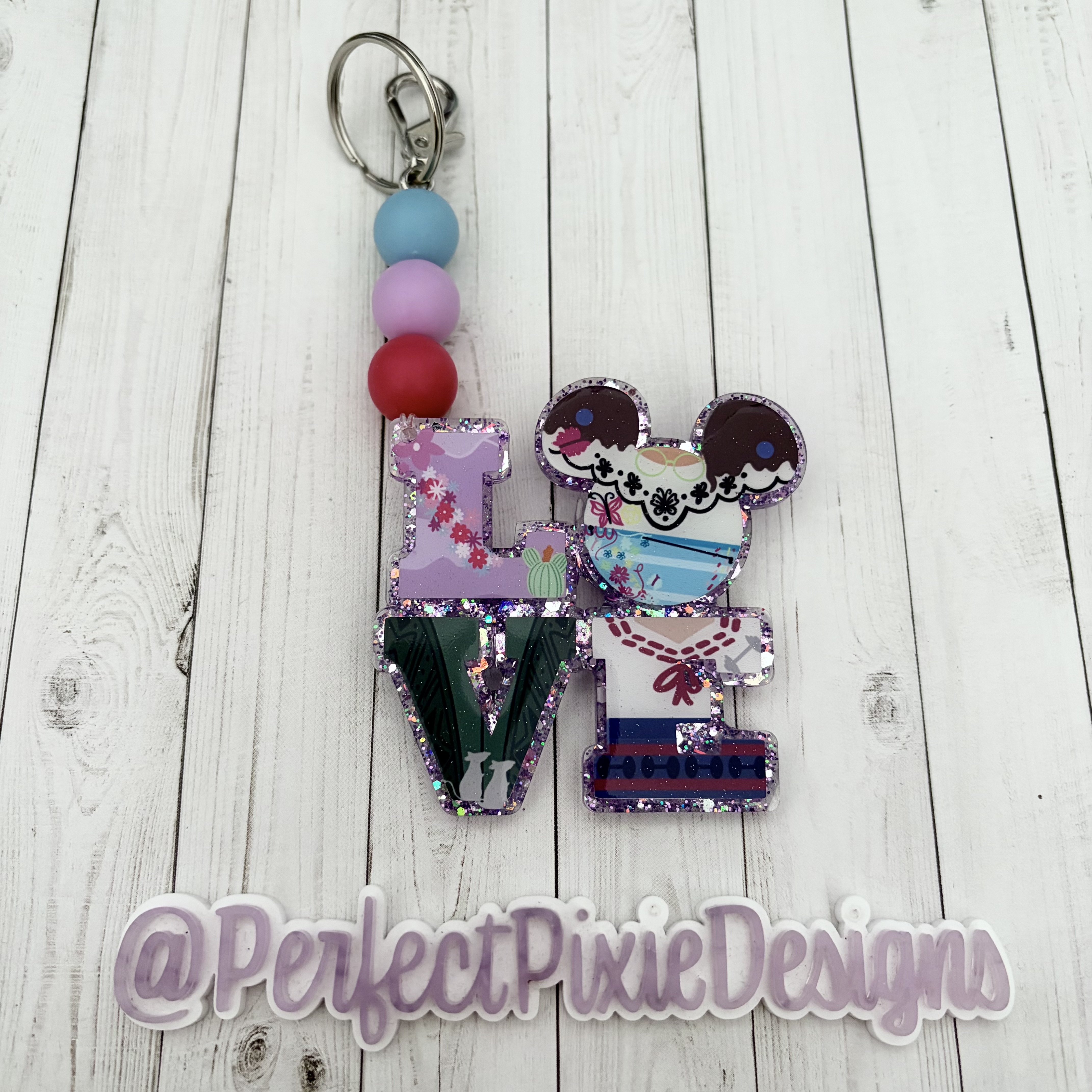 Our keychain/bag charms are made from 3" acrylic blanks, resin, sealed glitter and glass bead accents. Images are printed on waterproof vinyl and laminated, then sealed under resin. They are rated as "water resistant", but do not submerge them or expose them to extreme temperatures for long periods of time. Please take care to avoid bumping on hard surfaces.