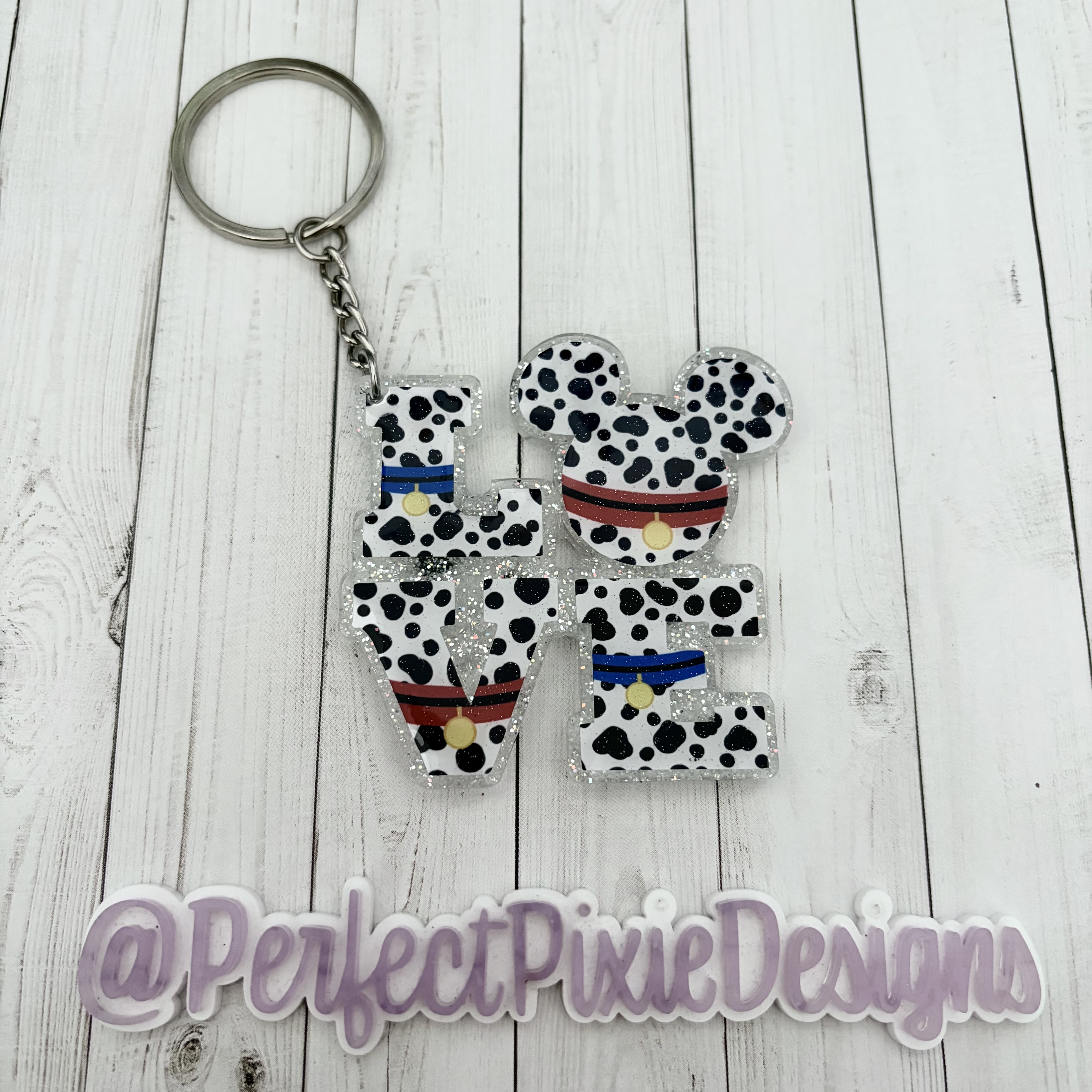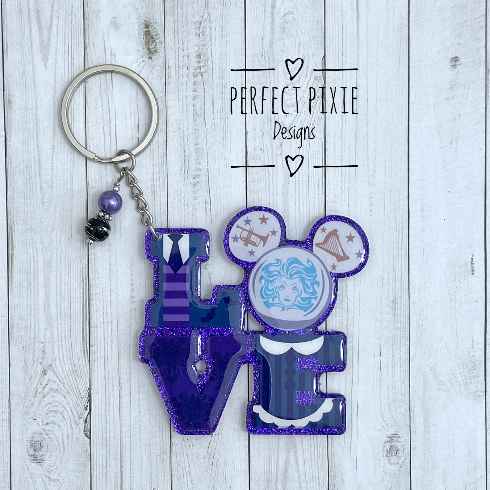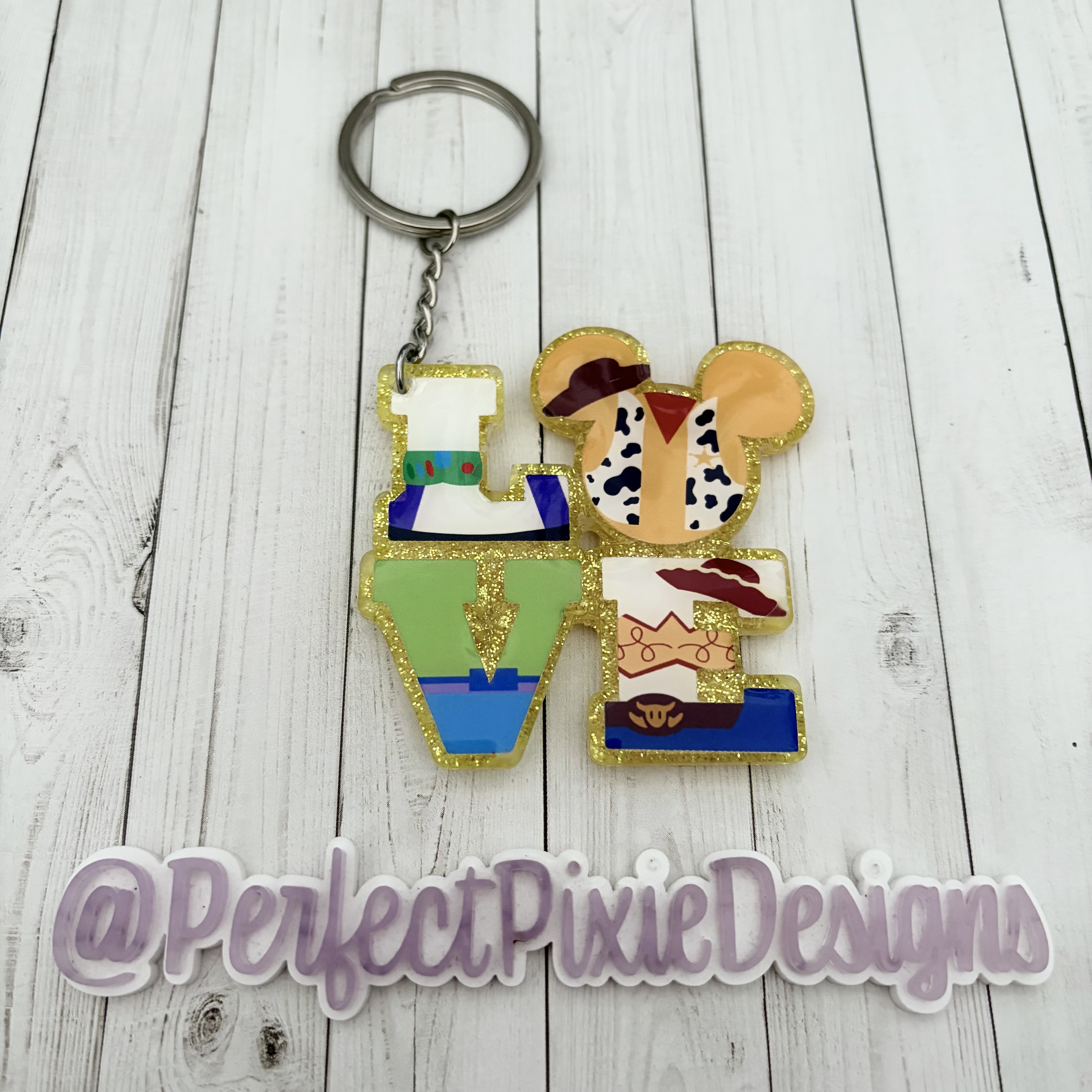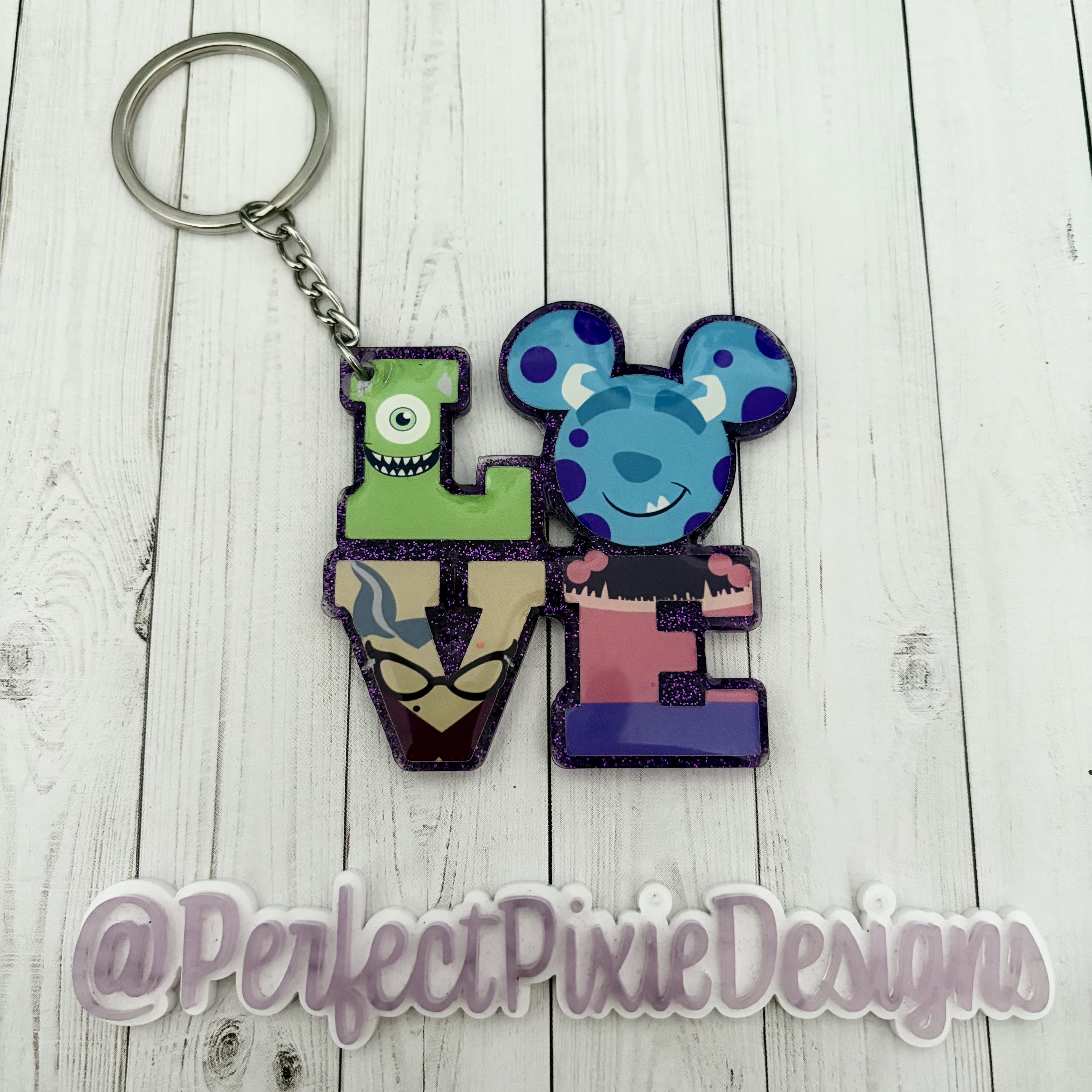Our keychain/bag charms are made from 3" acrylic blanks, resin, sealed glitter and glass bead accents. Images are printed on waterproof vinyl and laminated, then sealed under resin. They are rated as "water resistant", but do not submerge them or expose them to extreme temperatures for long periods of time. Please take care to avoid bumping on hard surfaces.