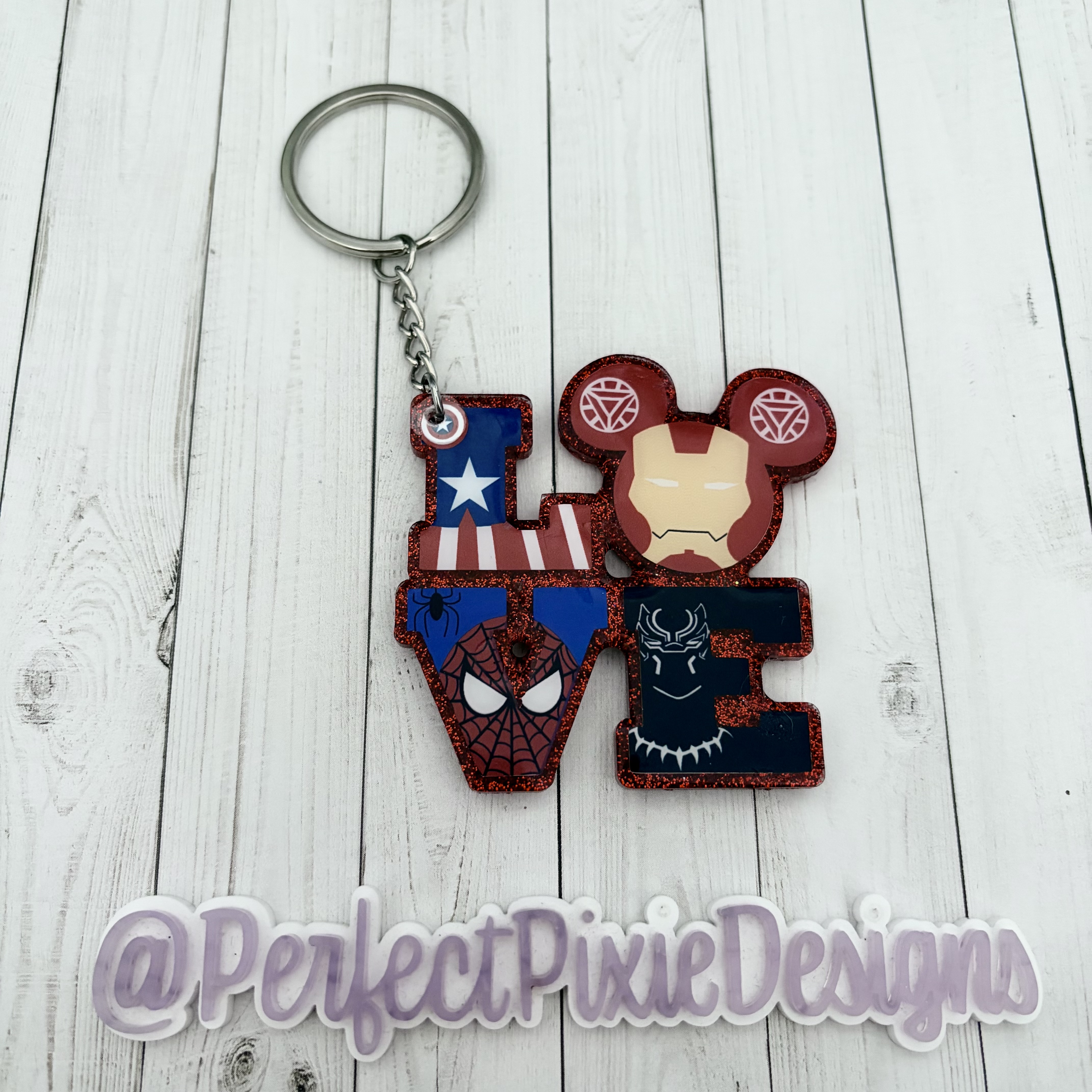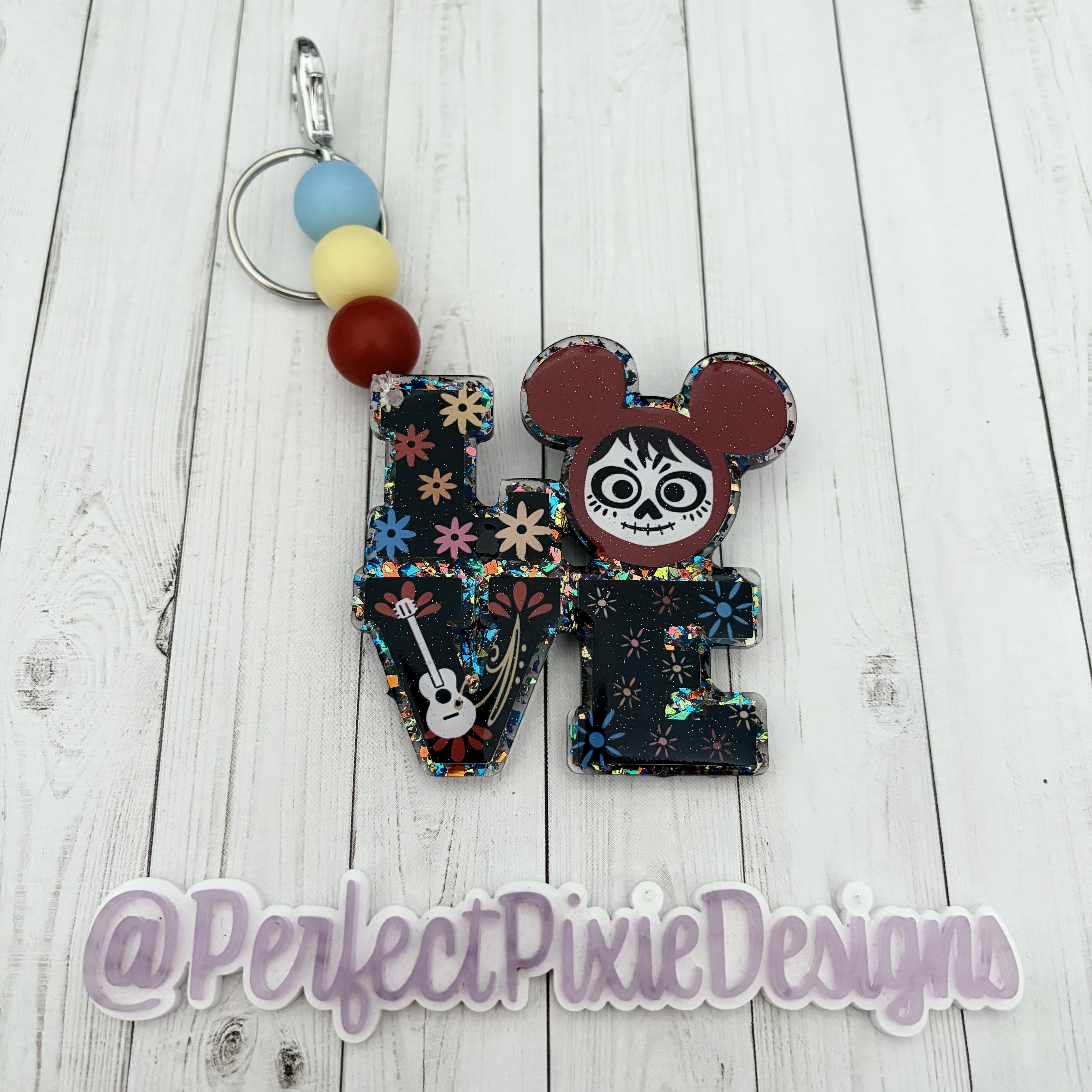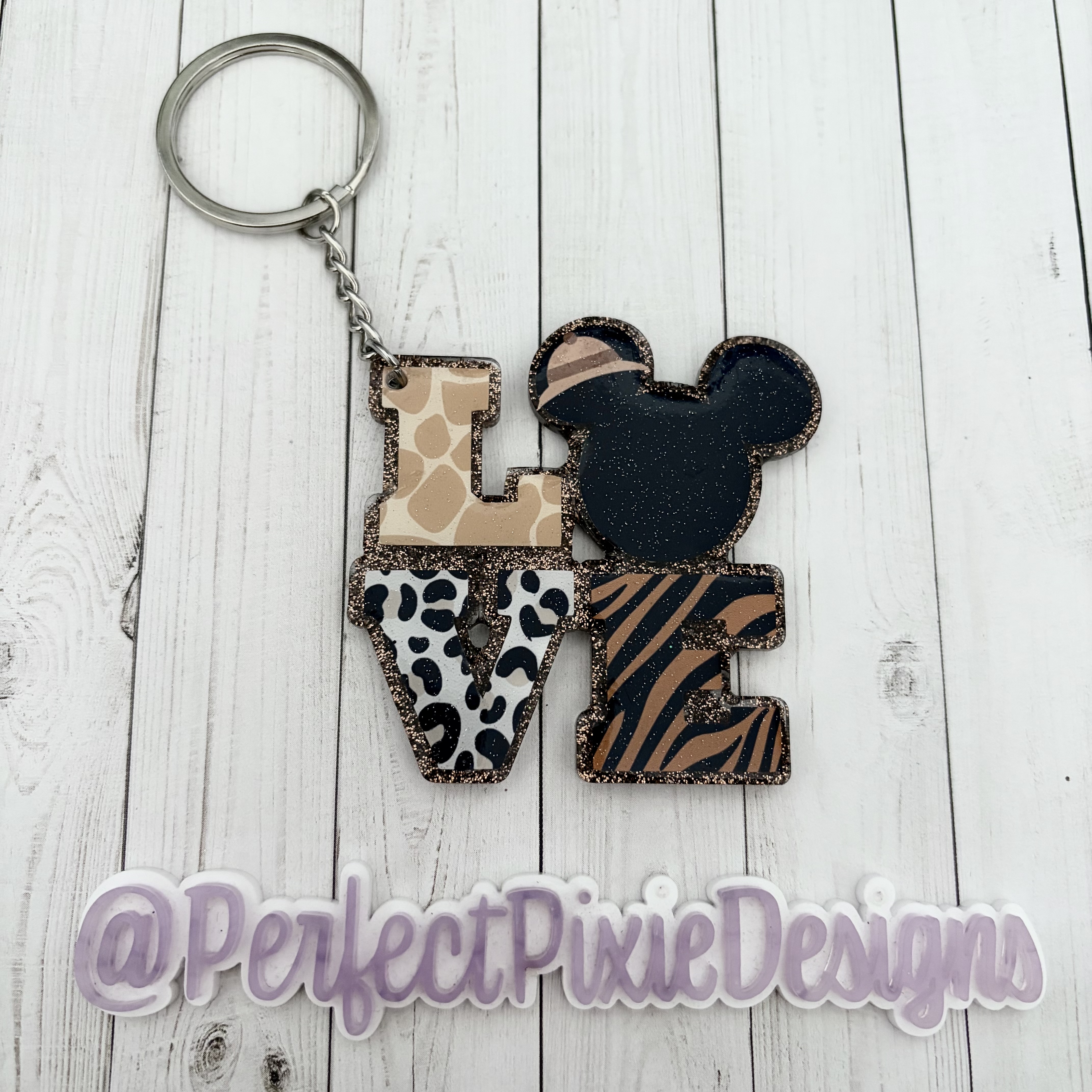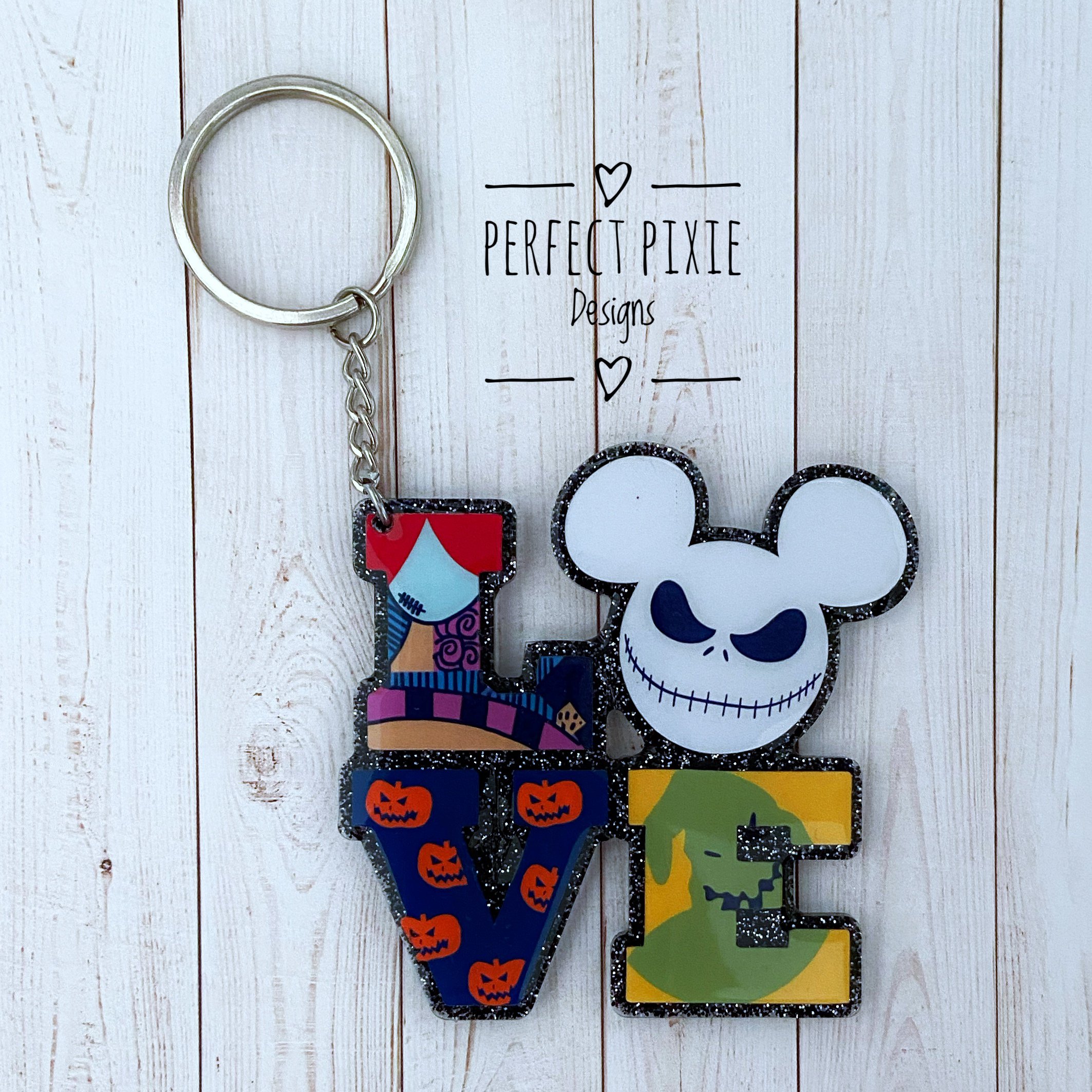 Our keychain/bag charms are made from 3" acrylic blanks, resin, sealed glitter and glass bead accents. Images are printed on waterproof vinyl and laminated, then sealed under resin. They are rated as "water resistant", but do not submerge them or expose them to extreme temperatures for long periods of time. Please take care to avoid bumping on hard surfaces.