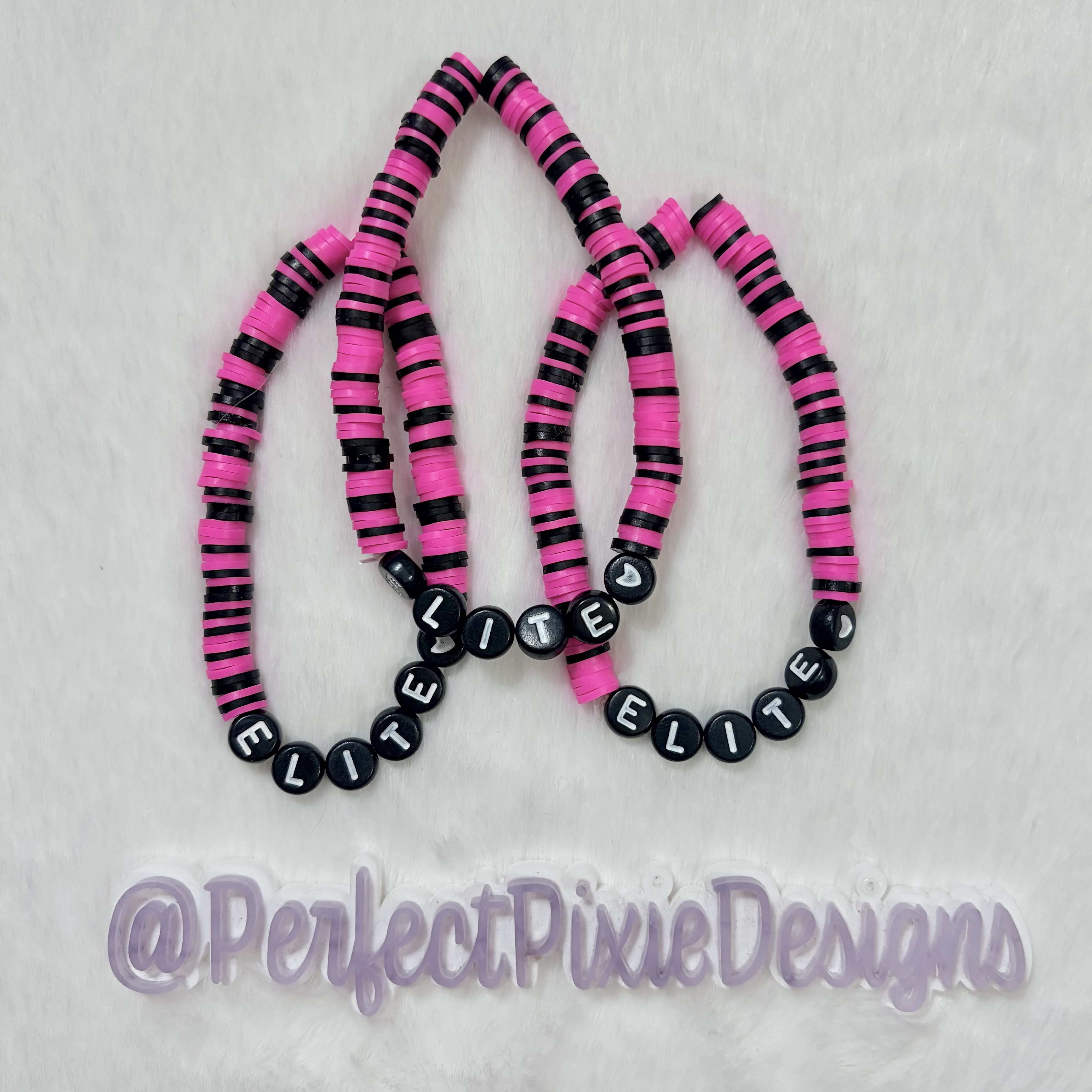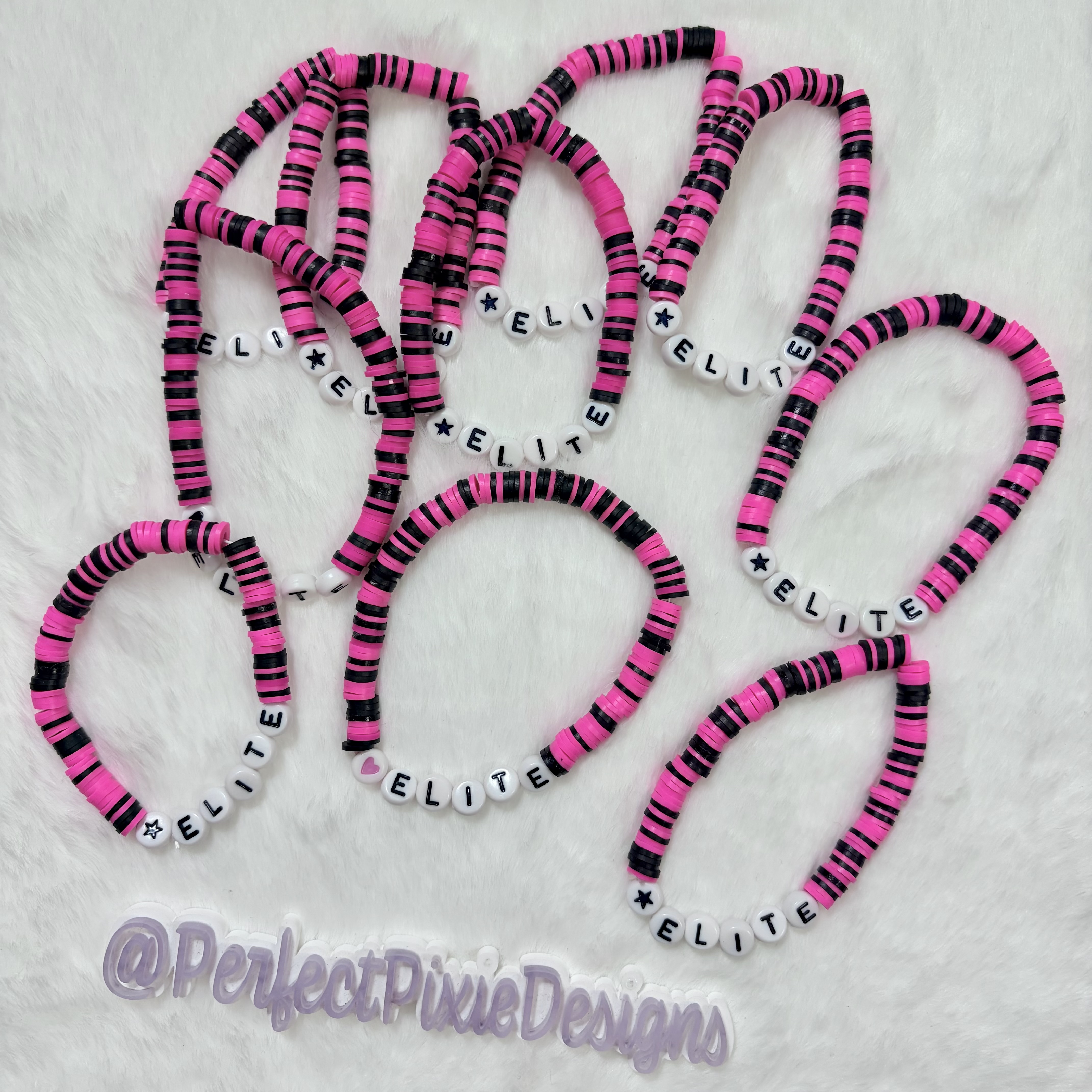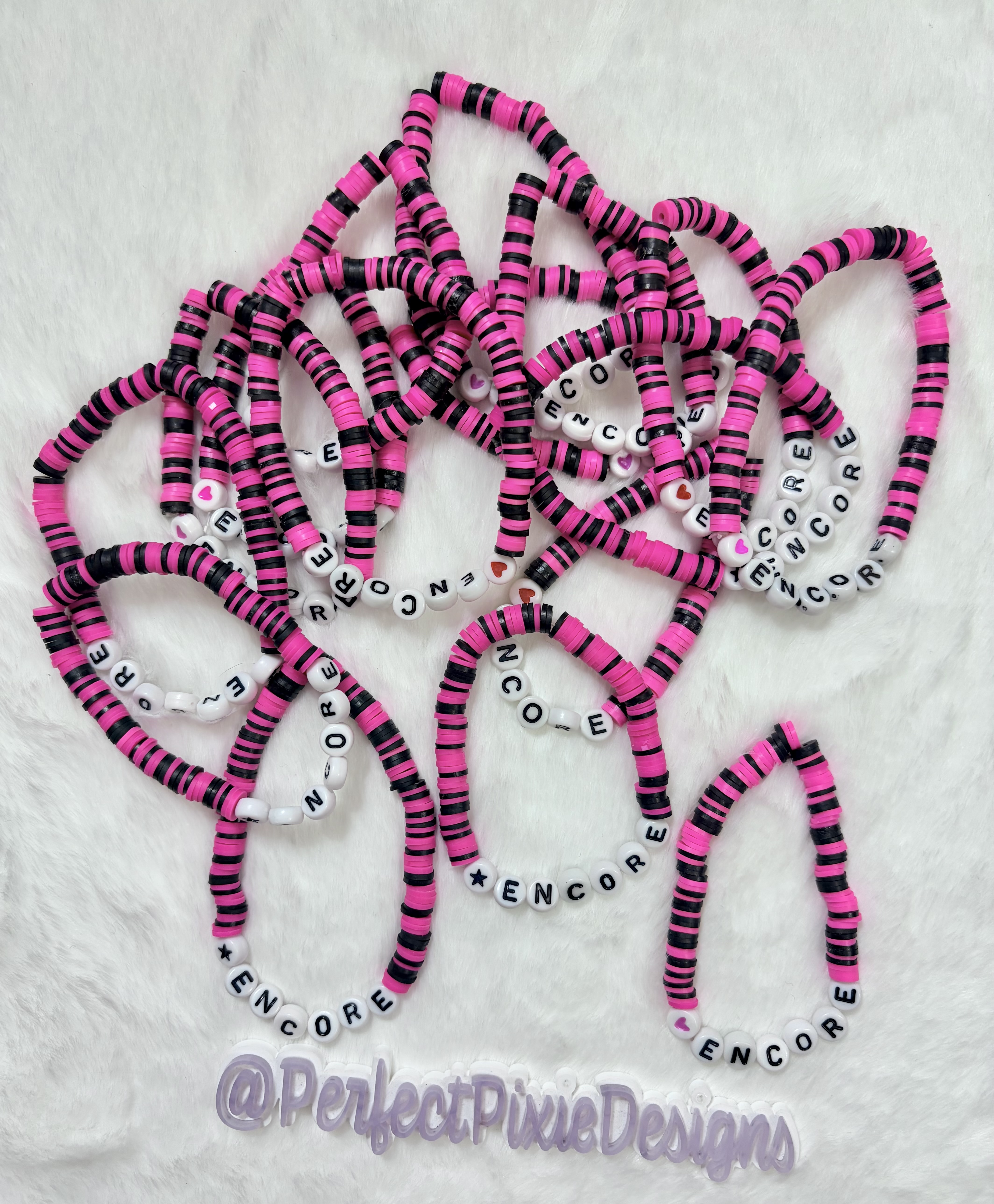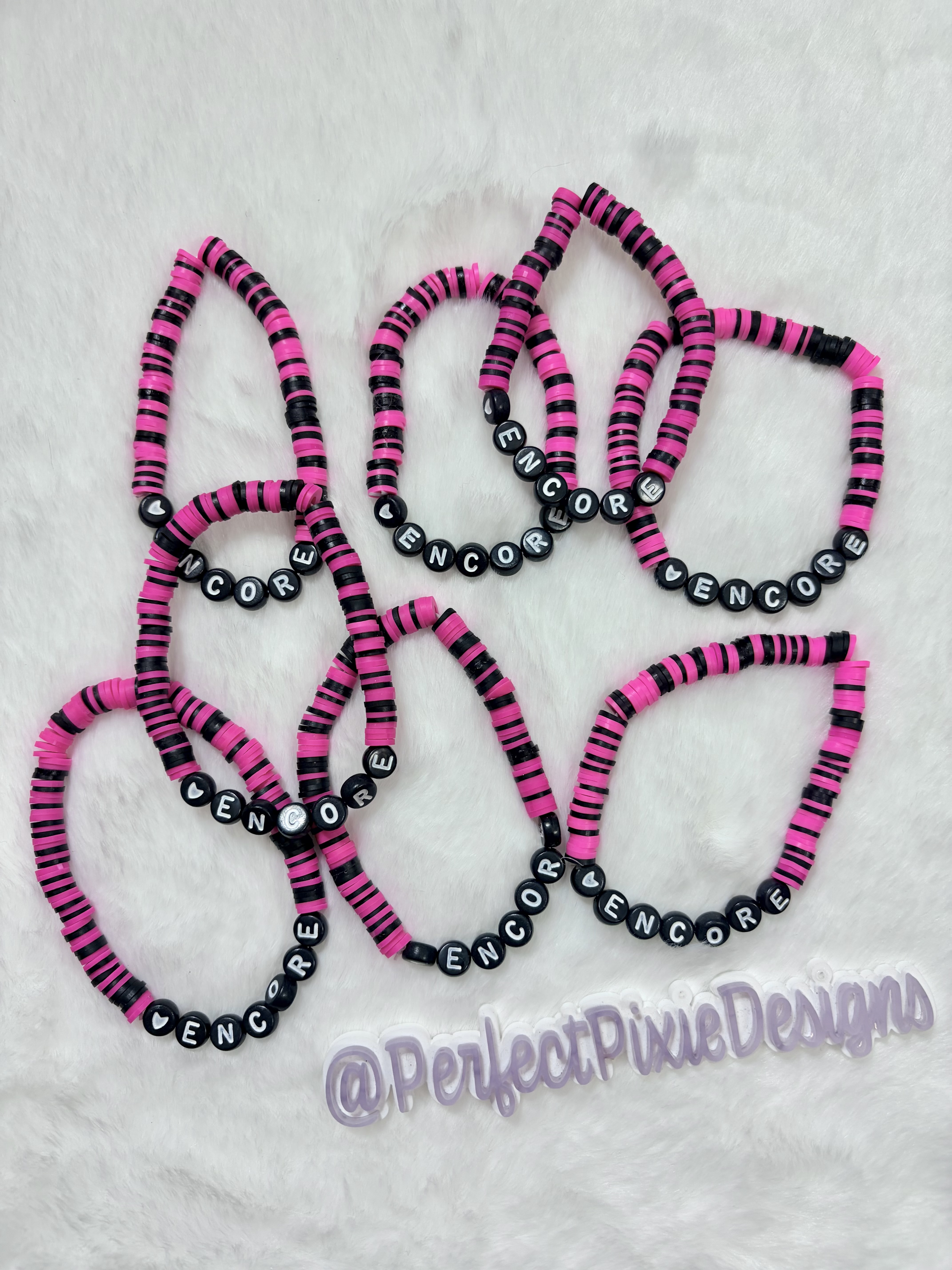 Show off your love for Encore with Studio Friendship Bracelets.  Made with neon pink and black clay beads, plastic letter beads, and elastic.